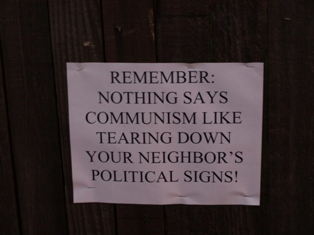 Tim pointed out that it’s not really communism; more like fascism. I thought it reminded me of the neighborhood committees in China, in which neighbors kept an eye on one another’s ideological purity. It’s also possible that it was random vandalism by drunken college students — not unknown in our ‘hood.