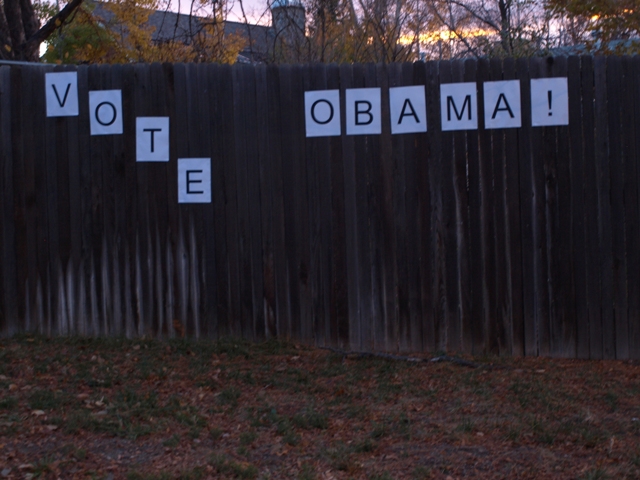 Closer to home, the two Obama signs I had stapled to our fence were torn down. Too lazy to drive to Obama HQ and get new signs, I resorted to more basic First Amendment tools: the inkjet printer and staple gun.