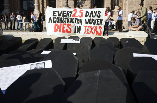 {Image description: Photo of a large banner displayed in front of a (government?) building. The banner reads “Every 2.5 Days A Construction Worker Dies in Texas.” The foreground of the photo is entirely occupied by black coffins.}
