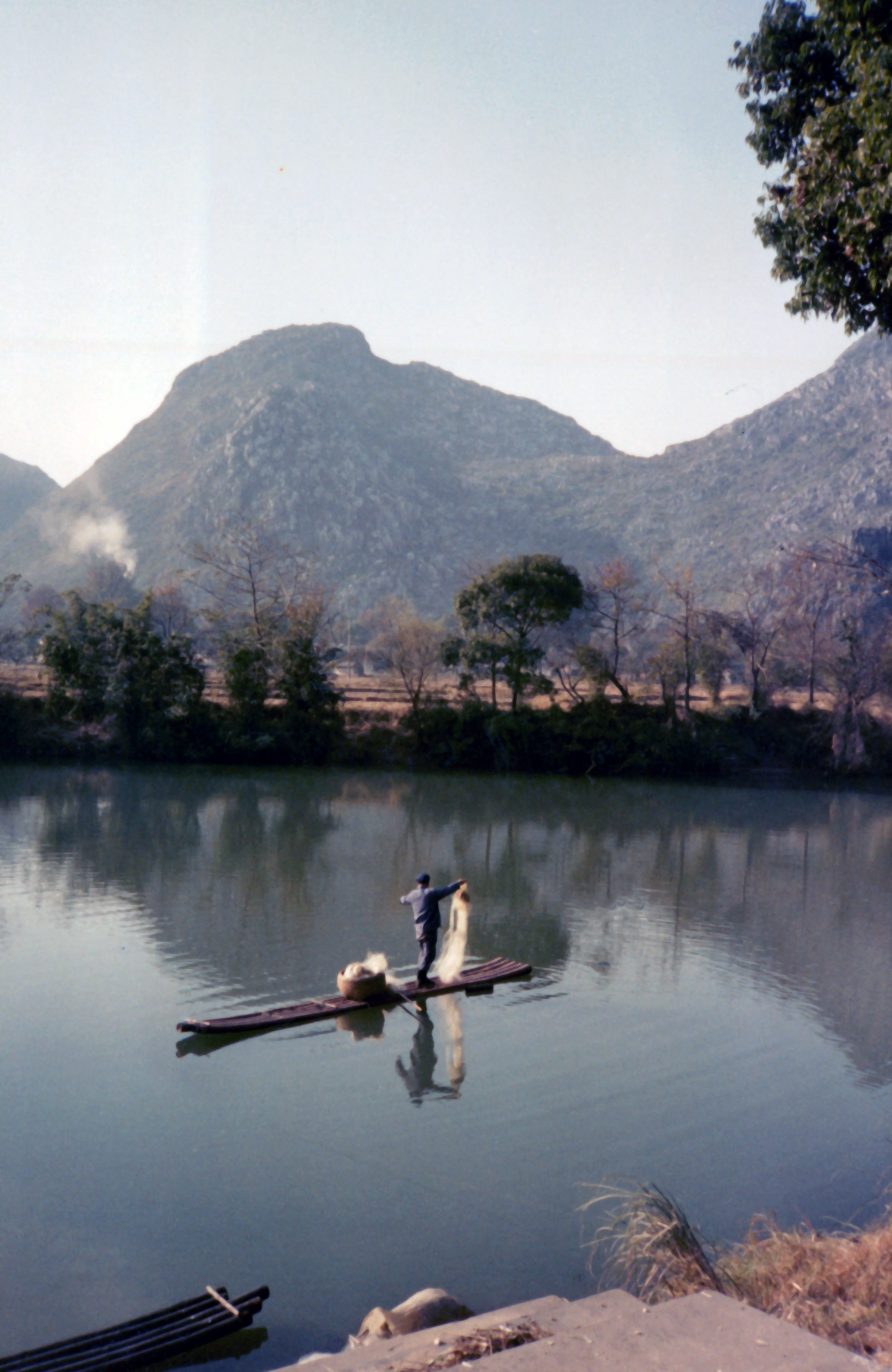 9. A local fisherman near Guilin balancing on his boat (which consisted of four long bamboo logs tied together and was not much different than balancing on a floating large sized diving board) as he strung out his nets. He sculled backwards with an oar in his right hand while feeding out some 200 yards of net from his left hand in a pattern that went back and forth across the river about eight times. Why, you might ask would one need eight separate layers of net. to catch fish coming down the river? Answer, the fish aren’t coming down the river. The fish live in a cave on the bottom of the river and after the nets are strung out the fisherman makes noise and scares the fish out of the cave and they come up in between the various webs of the net rather than being trapped by swimming into the net end wise. I wished I could have taken a movie of this operation because the grace with which he sculled backward with his right arm, fed the mass of net out neatly with his left hand, while balancing on his diving board all the while was astounding.