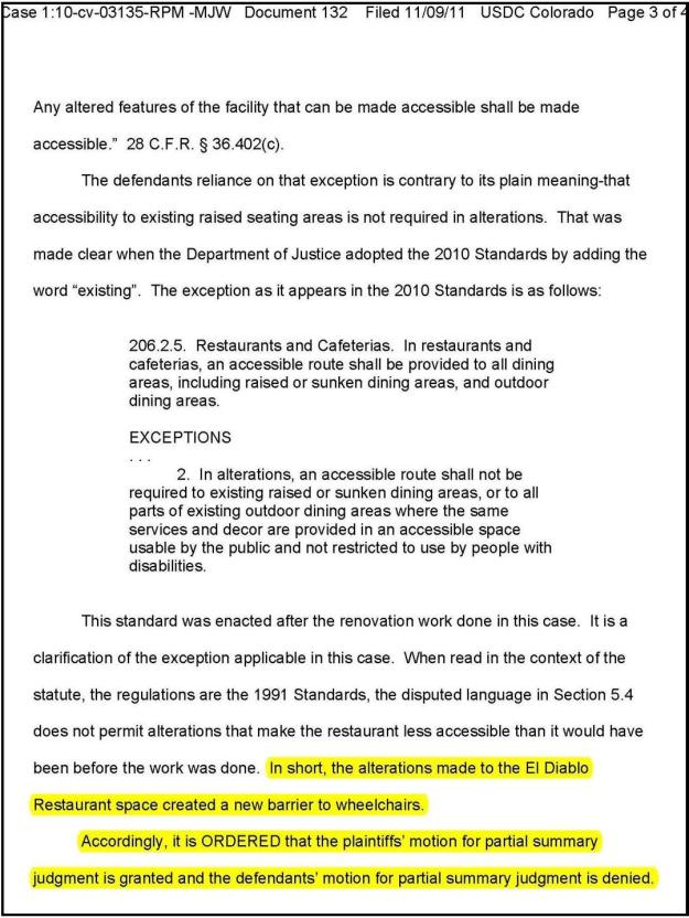In response to the lawsuit, the restaurant retained Littler Mendelson, a nationwide employment discrimination defense firm. And by “nationwide” I mean, of course, “expensive.”** Instead of working with us to make the place more accessible — and saving everyone’s attorneys’ fees — it’s been scorched earth litigation. But I think what has been most entertaining for us is the Littler lawyer’s decision to accuse CCDC of defamation. Yup: the fact that CCDC posts, on its website, the pleadings — public documents — containing the undisputed facts above — took a flat space; made most of it inaccessible — constitutes defamation. Here is the Littler Mendelson attorney, verbatim, in a deposition of CCDC’s executive director: