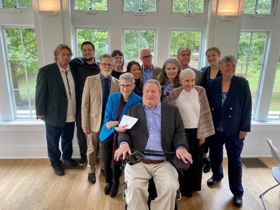 Group photo, various rows from left to right: Duncan North (white man; suit; bolo tie); Christian Robertson (white man; beard; dark sweater); Rodney North (white man; tan suit; gray hair & goatee); Petra Robertson (white woman; short brown hair; black dress); me (white woman; gray hair; blue jacket; glasses); Kara Aquino (Asian woman; black dress; necklace); Bruce Robertson (white man; bald head; blue shirt); Tim Fox (white man; blue shirt; wheelchair); Donna Desrochers (white woman; salt & pepper hair; checked scarf); Ruth Blau (white woman; white shirt; gorgeous shawl that of course she knitted); Gregory North (white man; gray hair; suit); Becky McQuilken (white woman; red hair; dark suit); Annie McQuilken (white woman; blue suit; patterned shirt).