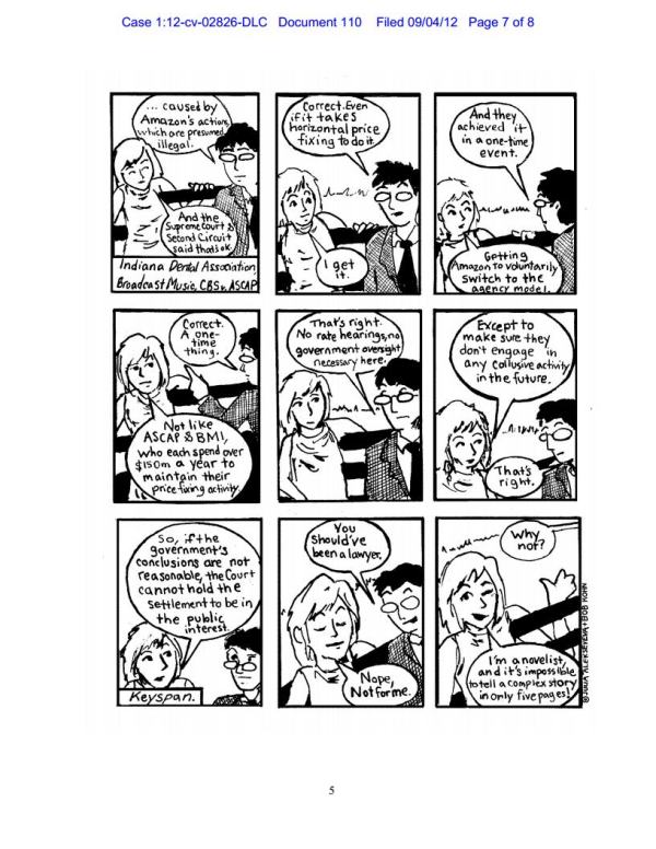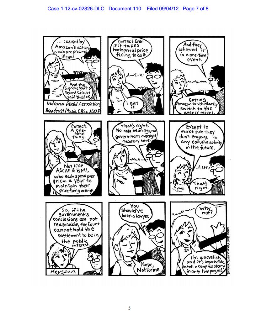 This brief writer was given five pages to express a series of complex antitrust arguments. Result: a format I want with all my heart and soul to use in my next brief. As you can see from the ECF header, this was filed with the court. I don’t understand the antitrust or economic theory, but check out the last panel for an excellent punchline.