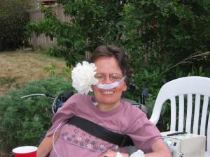 Carrie Ann Lucas. [Image: Carrie, a large white appearing woman in a colorful dress, in a power wheelchair using a vent; her daughter Heather, a smaller white appearing woman in a plaid shirt and jeans, in a wheelchair; behind Heather, Carrie’s daughter Aszia, a tall dark skinned woman in a t-shirt and jeans; Carrie’s son Antonio, a white appearing teenage boy in a brown shirt; Carrie’s daughter Cinthia, a light skinned teenage girl in a pink tank top in wheelchair; and Carrie’s daughter Adrie, a dark skinned teenage girl with a blue shirt and blue hair tie, in a power wheelchair.]